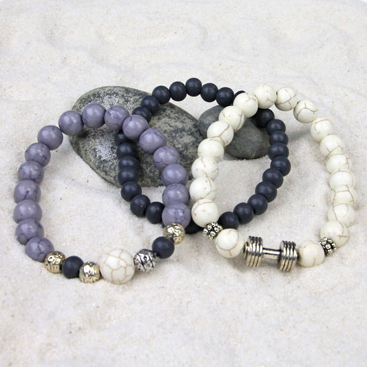 Men's Bracelets Set of 3 Beaded Stretch Bracelets Stack in Marbled White and Greys - M13