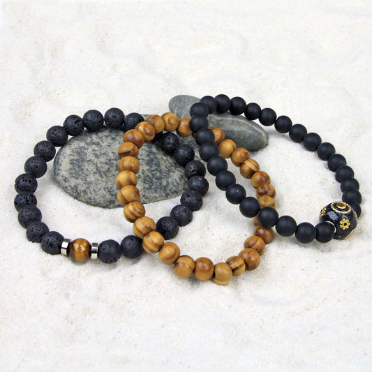 Men's Bracelets Set of 3 Beaded Stretch Bracelets Stack in Tones of Black and Natural Wood - M20
