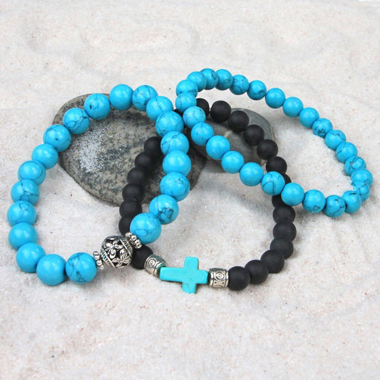 Men's Bracelets Set of 3 Beaded Stretch Bracelets Turquoise and Black Stack - M6