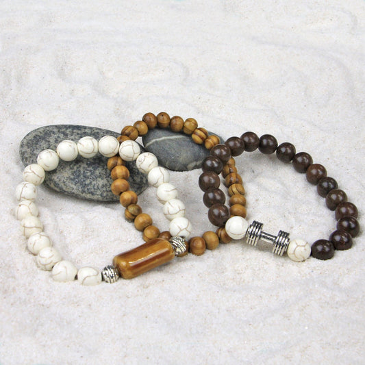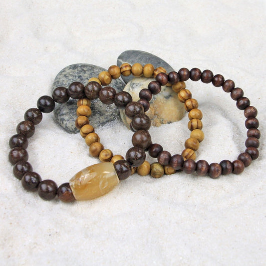 Men's Bracelets Set of 3 Beaded Stretch Bracelets Stack Wooden Beads Natural Tones - M17