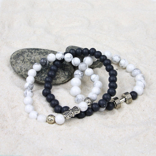 Men's Bracelets Set of 3 Beaded Stretch Bracelets Stack in Cream and Black - M16