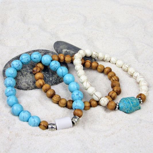 Men's Bracelets Set of 3 Beaded Stretch Bracelets Stack in Cream and Turquoise Yoga Buddha Theme - M19