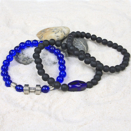 Men's Bracelets Set of 3 Beaded Stretch Bracelets Stack Blues and Black - M2