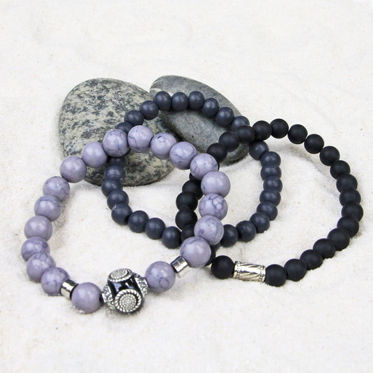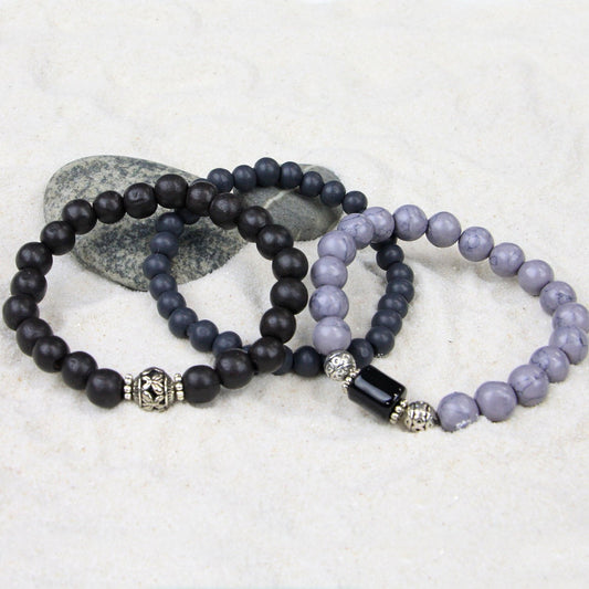 Men's Bracelets Set of 3 Beaded Stretch Bracelets Stack in Muted Grey and Blacks - M4