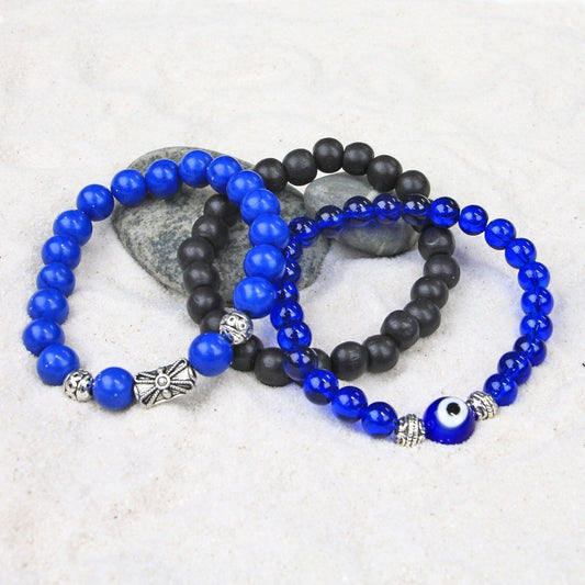 Men's Bracelets Set of 3 Beaded Stretch Bracelets Evil Eye Stack Blues and Black - M7