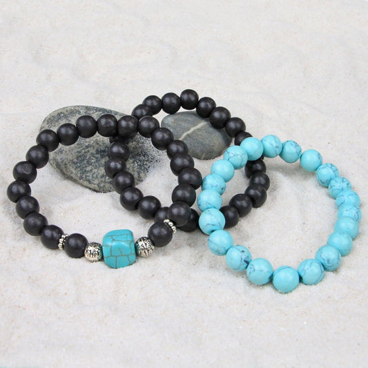 Men's Bracelets Set of 3 Beaded Stretch Bracelets Turquoise and Black wooden Bead Stack - M10