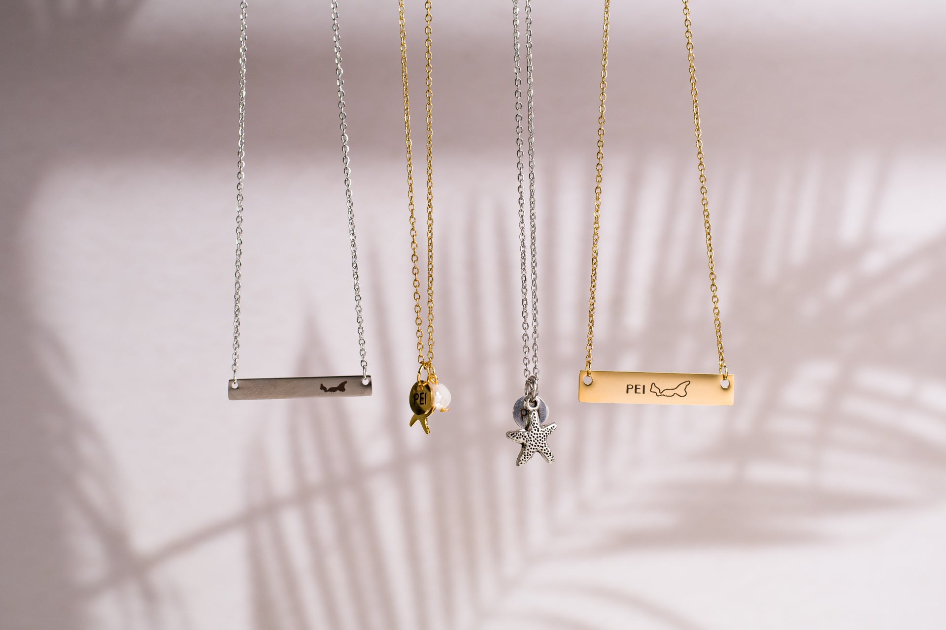 These necklaces can be customized with a location, shop name or phrase of your choice.