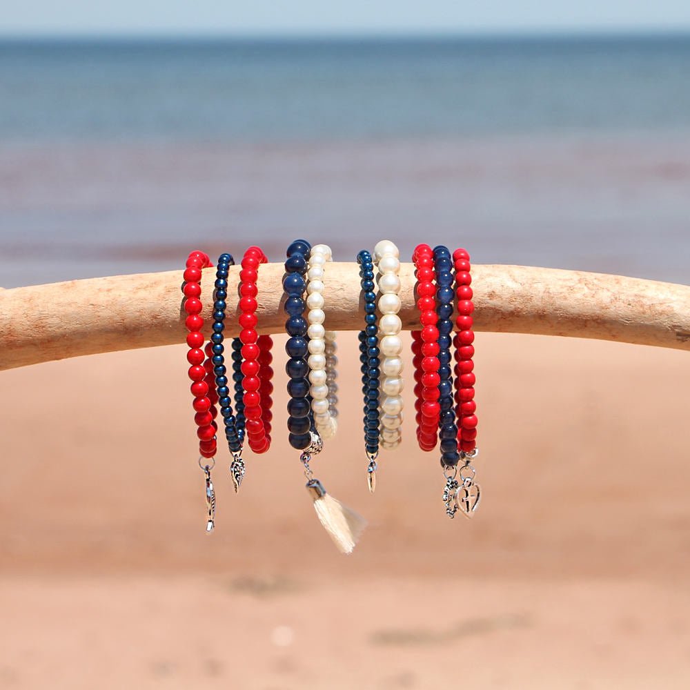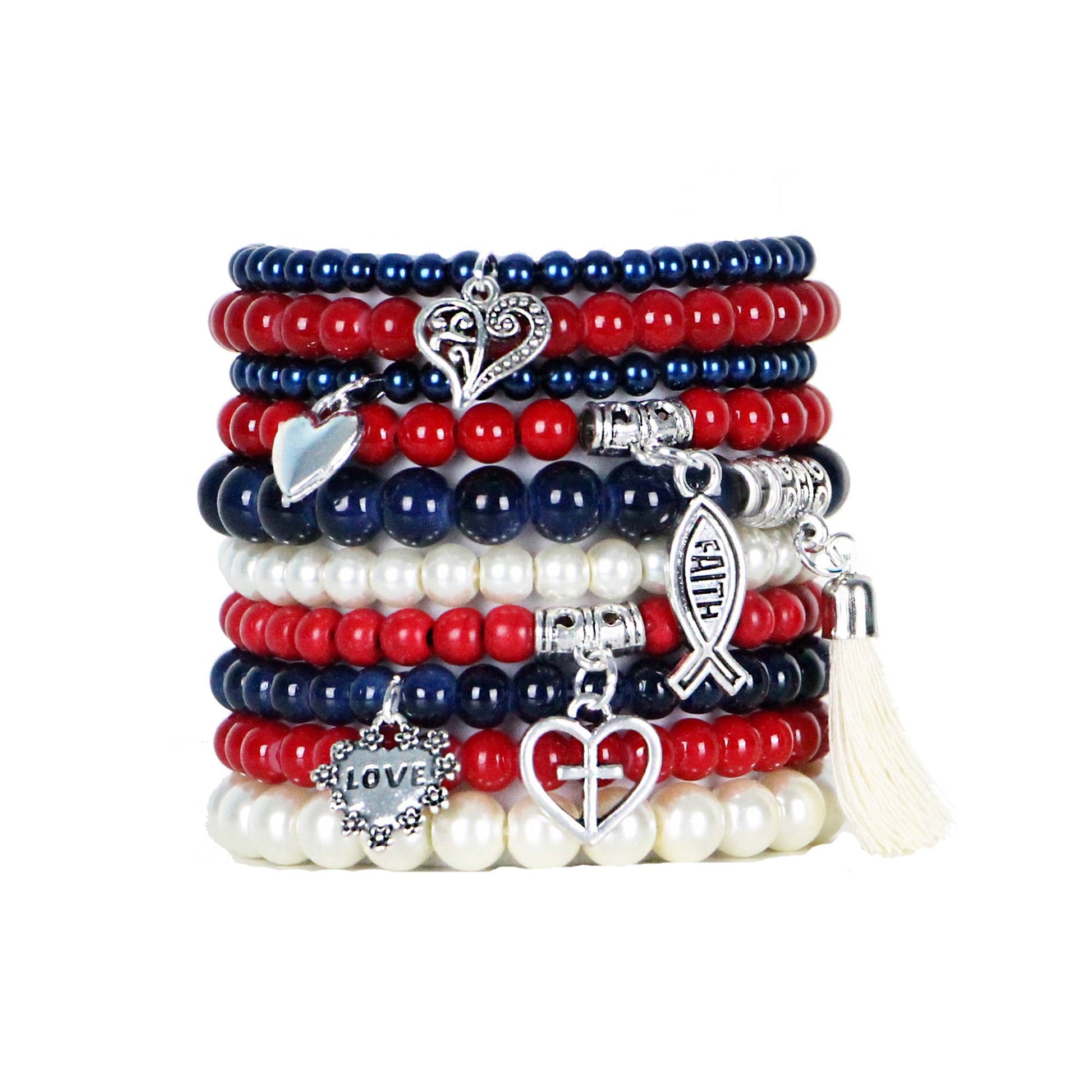 Take a look at this stunning set of stretch bracelets in a very traditional blue, red and white color design!