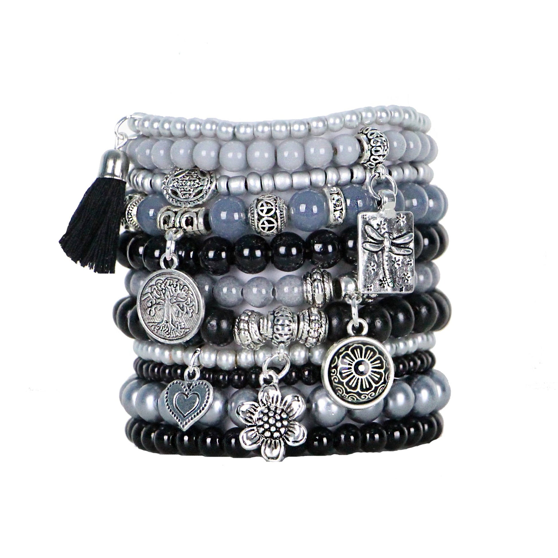 Take a look at this stunning set of stretch bracelets in a very traditional black, grey and silver color design!