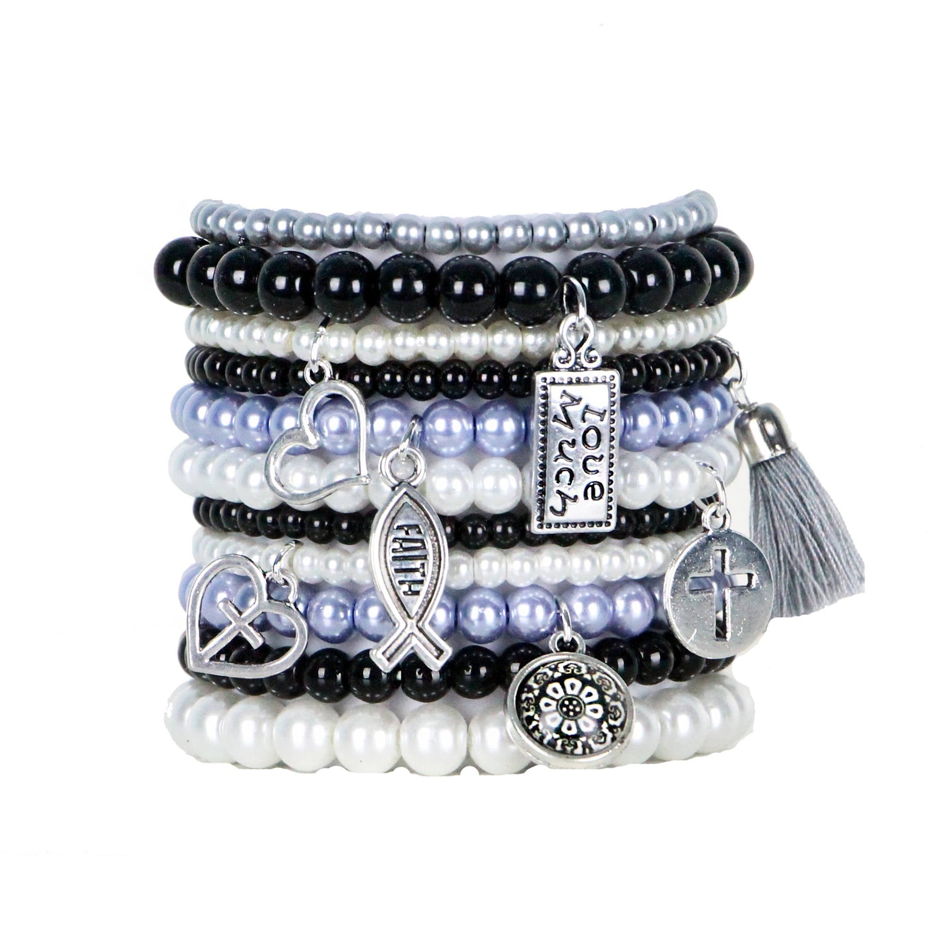 Take a look at this stunning set of stretch bracelets in a beautiful, eye-catching color scheme and faith inspired charms!