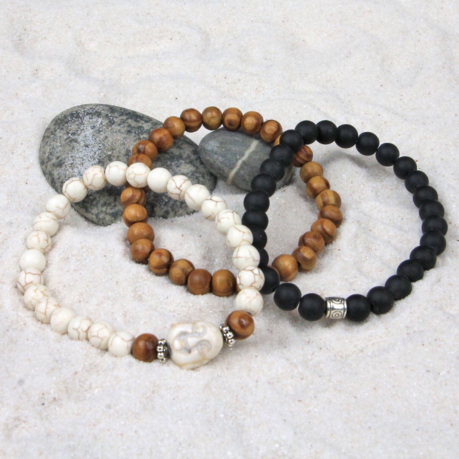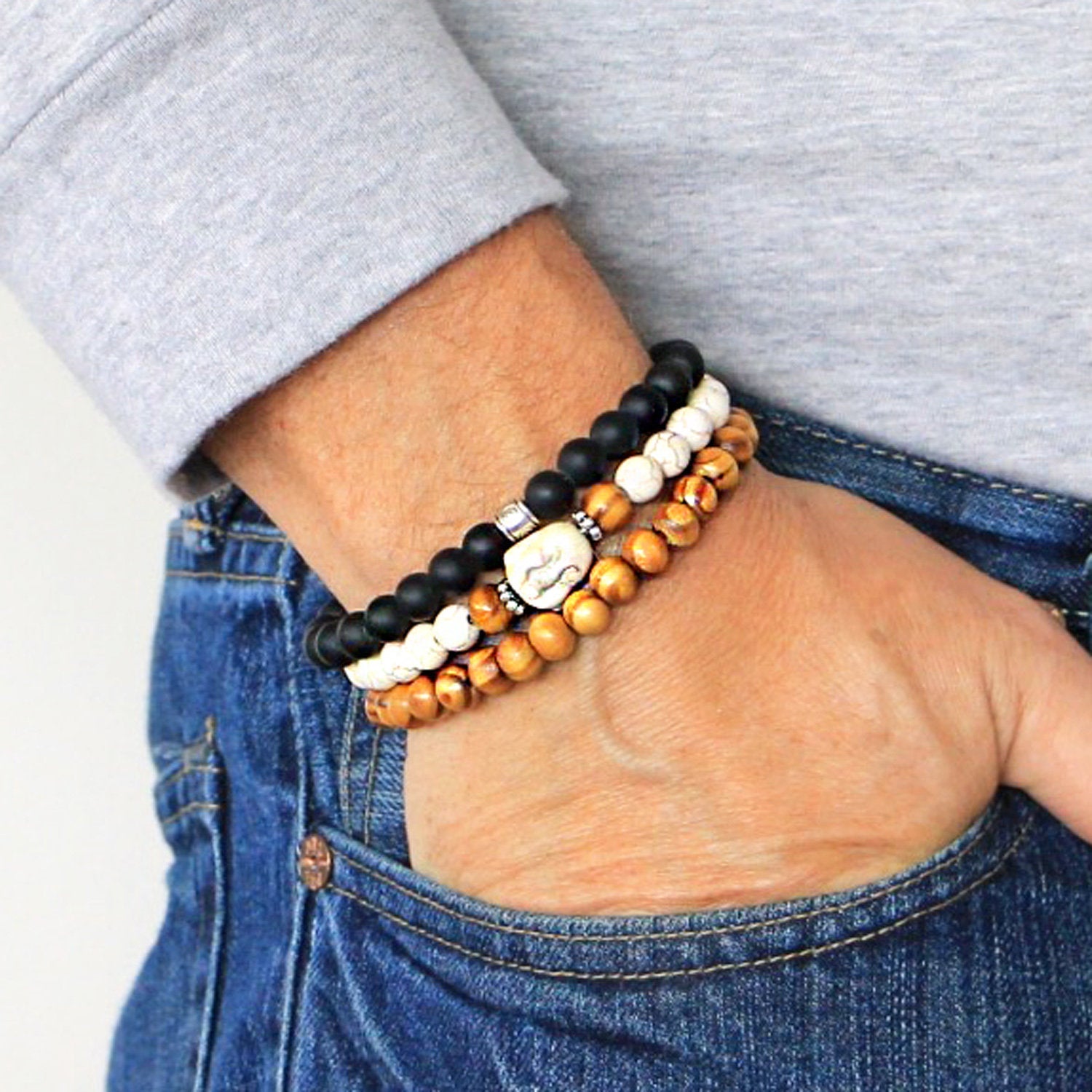 Take a look at this set of three men's stretch bracelets in a Buddha yoga theme.
