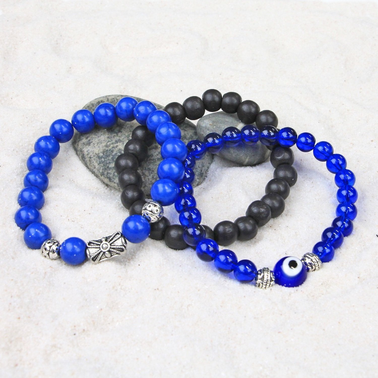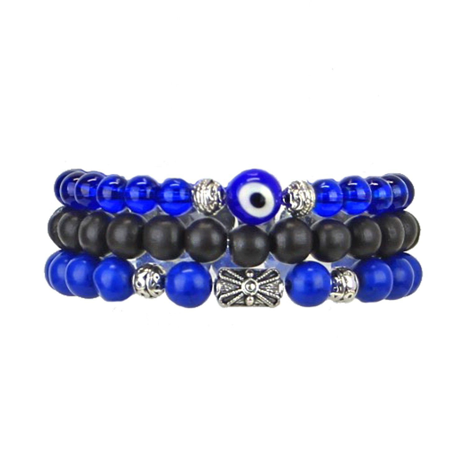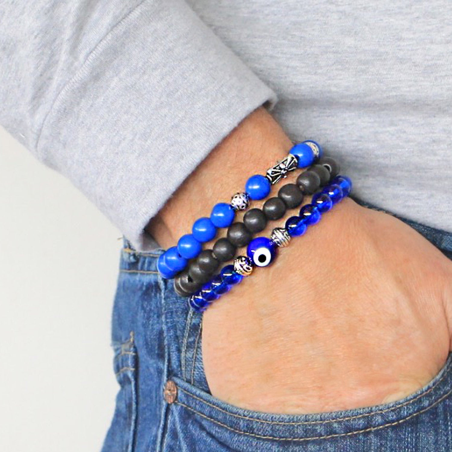 Take a look at this striking set of three stretch bracelets for men... in blues and black with an evil eye theme.
