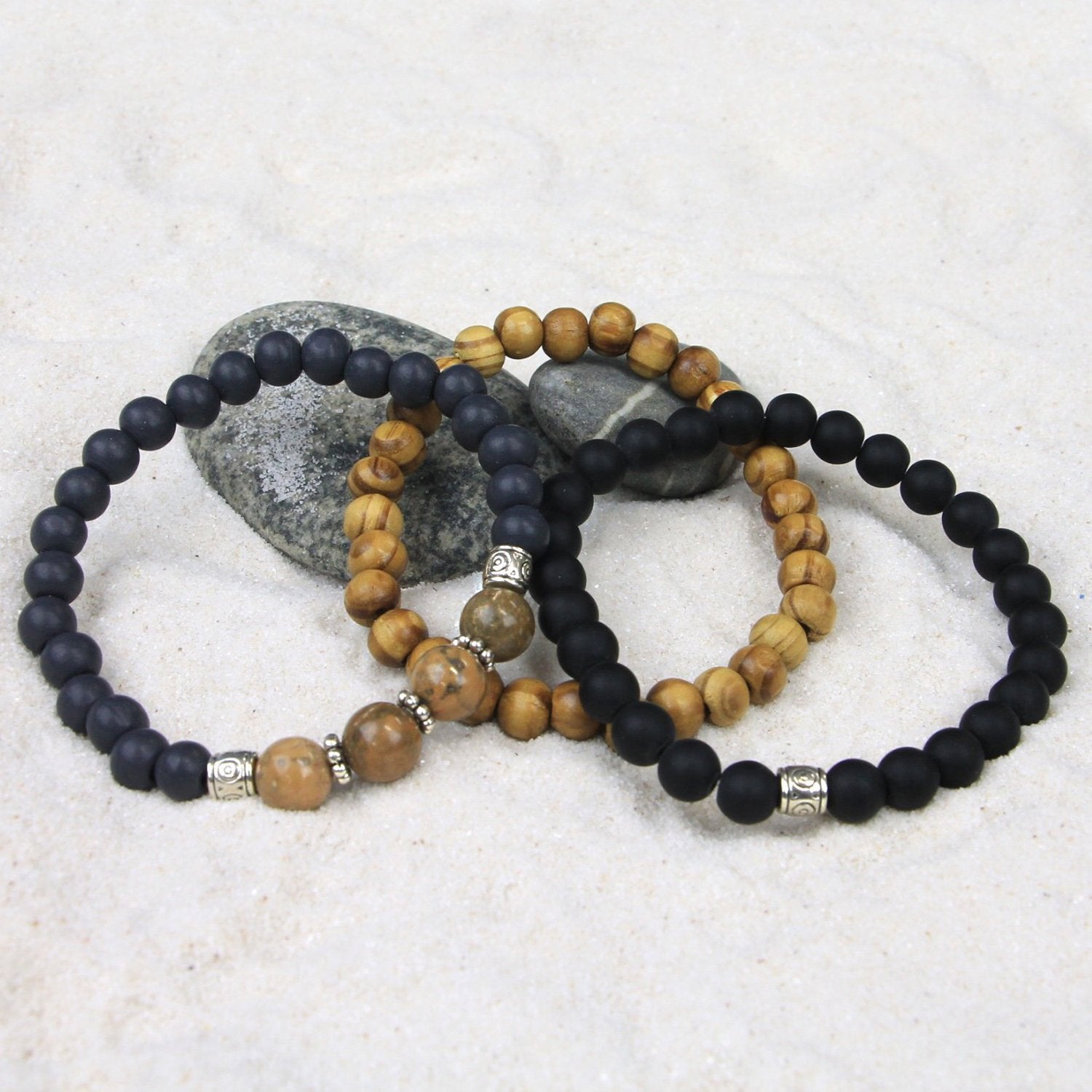 Each set is made from a variety of 8mm beads: wood and glass... with a jasper and silver alloy accent beads.