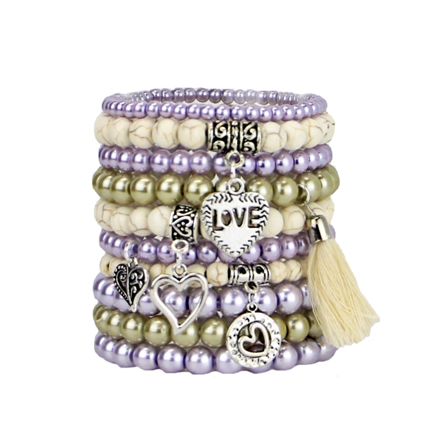 Take a look at this stunning set of stretch bracelets with a love theme... in relaxing tones of lavender, sage and cream!